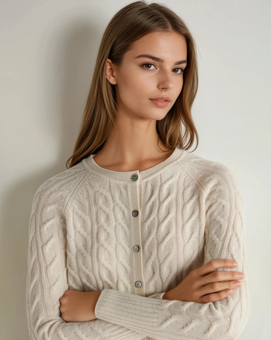 A wonderfully simple and stylish cable cashmere cardigan.