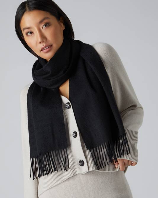 Wrap up in understated refinement. This woven scarf delivers effortless warmth with a featherlight handle and softly brushed finish. Long fringed edges nod to timeless tradition, while the generous proportions make it ideal for layering over outerwear or folding into your carry-on.