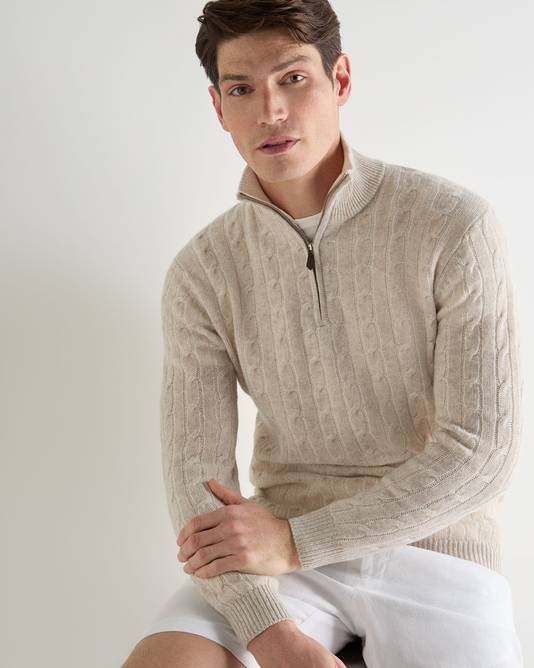 Men's Albemarle Cable Half Zip Cashmere Jumper In Sand Brown