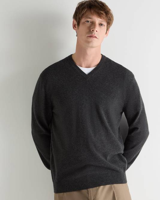 An effortless layer for refined dressing, this V-neck jumper blends classic tailoring with modern ease. Knitted from 100% organic 1-ply cashmere, it offers natural softness with a fine, breathable finish — perfect for wearing over a crisp shirt or under a tailored jacket.
