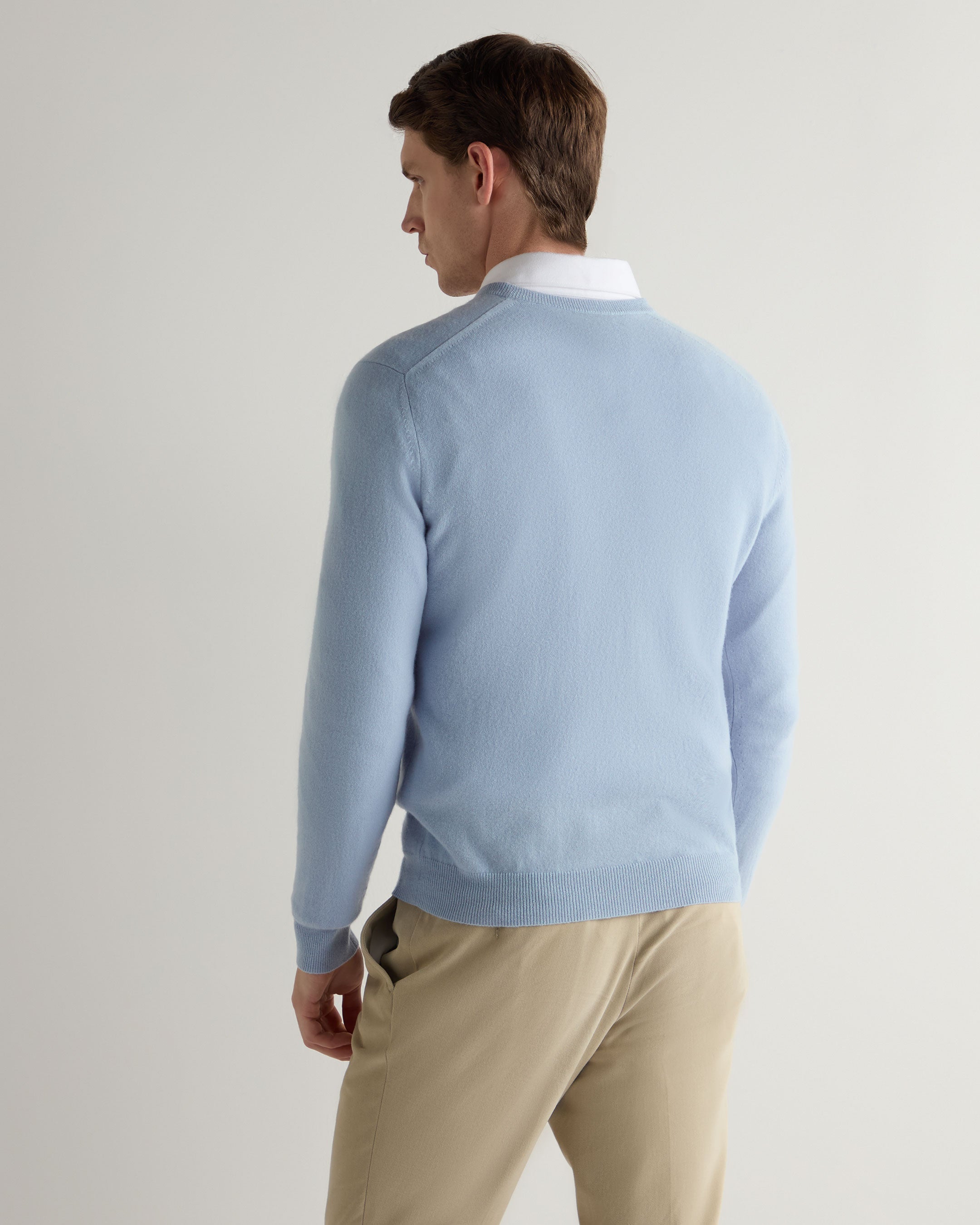 An effortless layer for refined dressing, this V-neck jumper blends classic tailoring with modern ease. Knitted from 100% organic 1-ply cashmere, it offers natural softness with a fine, breathable finish — perfect for wearing over a crisp shirt or under a tailored jacket.