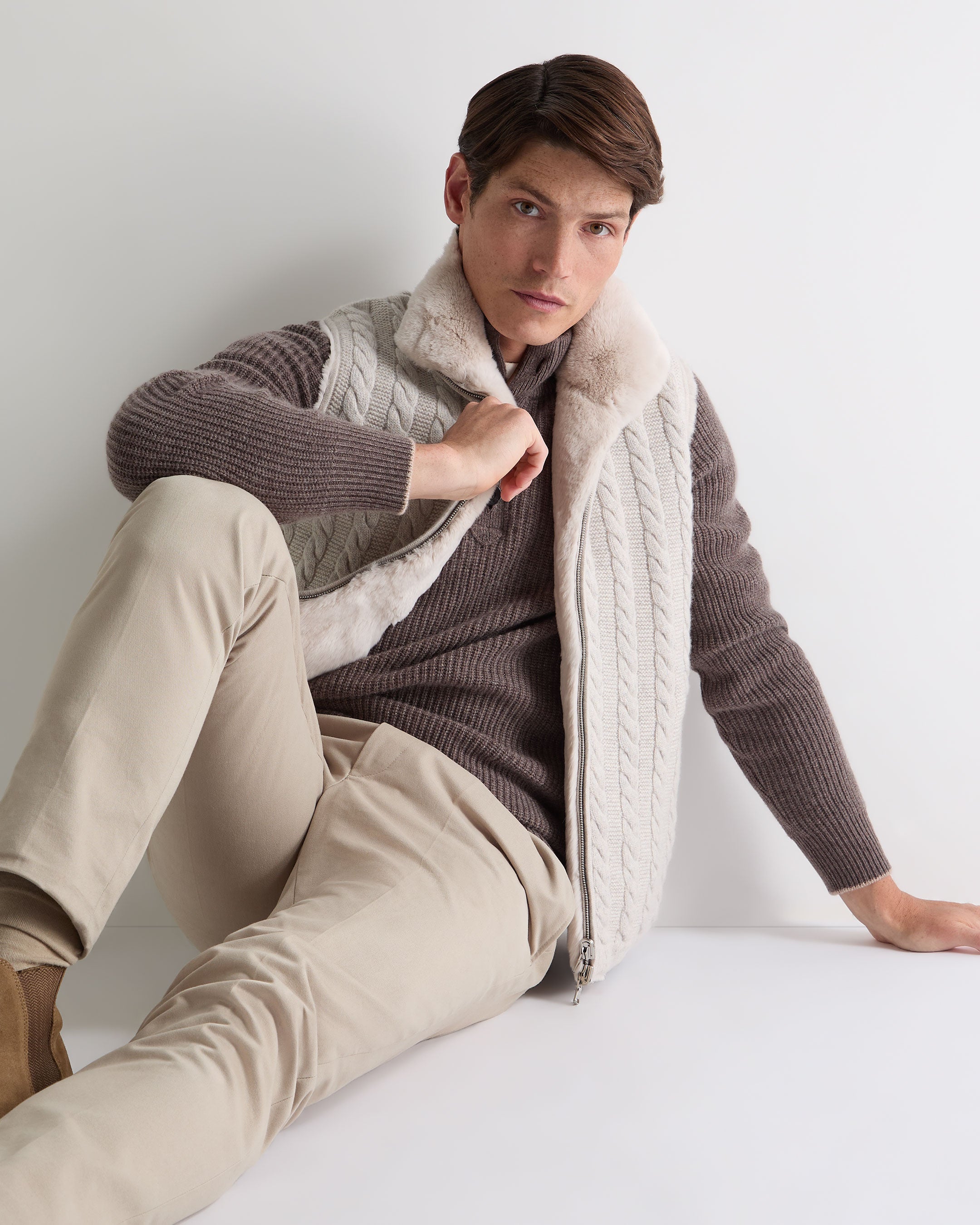 An elevated expression of warmth and texture, this cable-knit gilet brings refined craftsmanship to a timeless silhouette. Knitted from 6-ply 100% cashmere and lined with indulgent rex fur, it offers exceptional comfort and versatility — the perfect layer for effortless sophistication through the colder months.