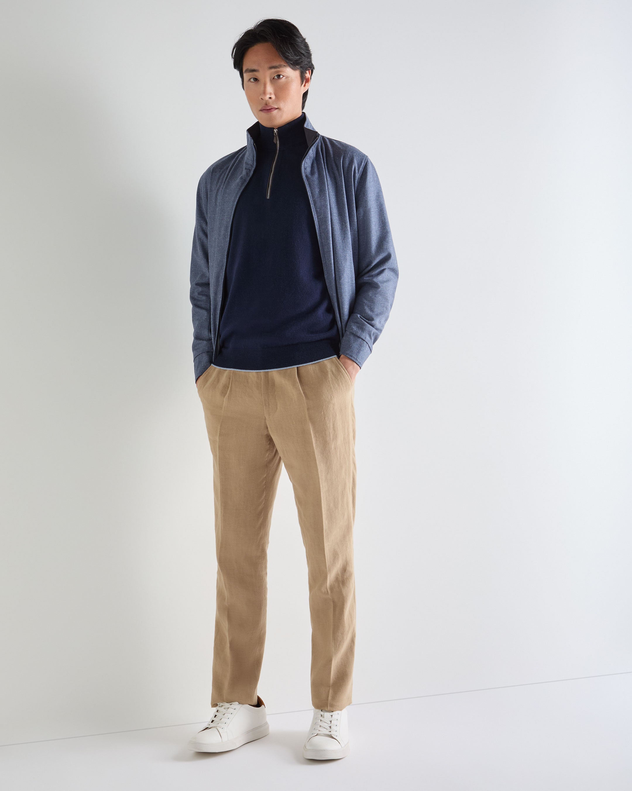 A timeless layer designed for refined versatility, this half-zip jumper blends relaxed sophistication with everyday ease. Knitted from 100% organic 1-ply cashmere, it offers breathable warmth and a luxuriously soft touch — perfect for effortless transitions between laid-back weekends and polished weekday dressing.