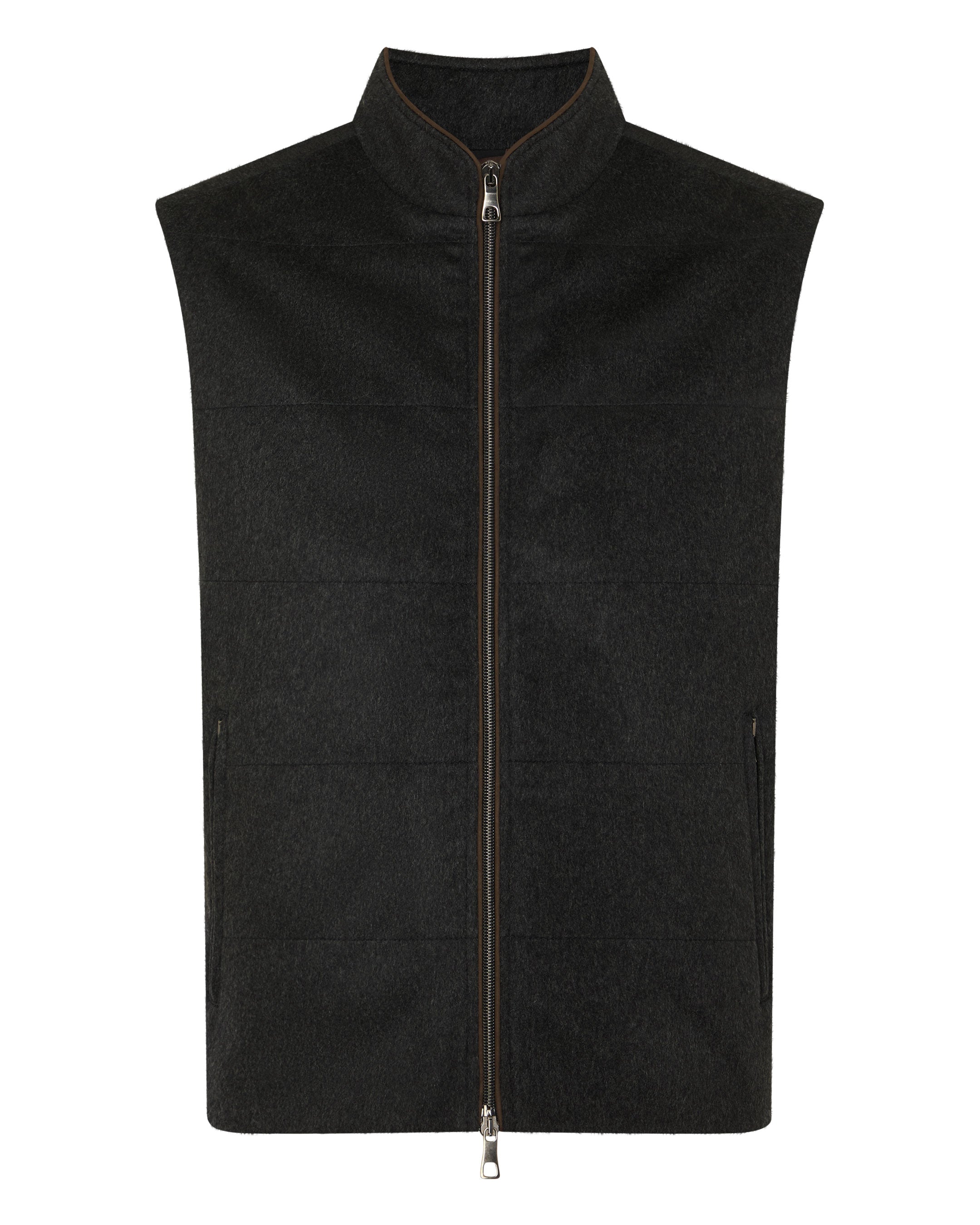 A refined outer layer designed for quiet moments outdoors, this gilet is crafted from pure Mongolian cashmere with softly structured knitted side panels that move with you. A bonded internal layer from our London Weather System™ offers discreet protection when the breeze picks up, while the clean two-way zip and subtle stitch detailing keep the silhouette sharp and confident. Perfect for countryside walks where comfort, warmth and polish go hand in hand.