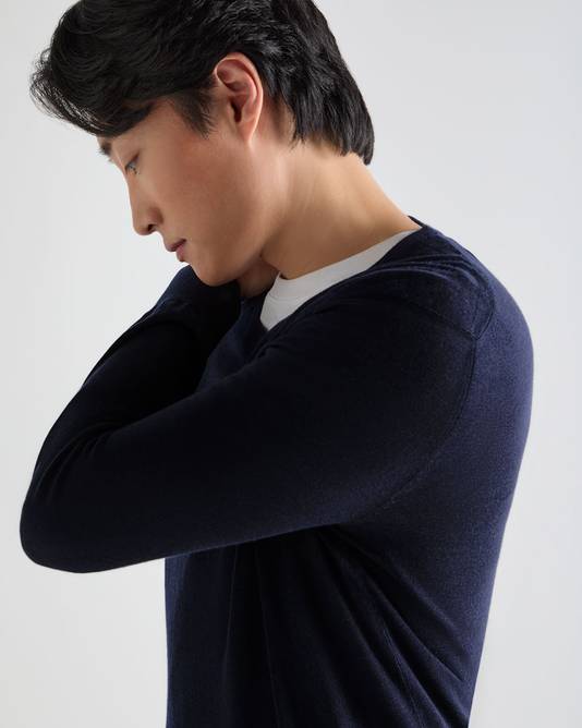 Lightweight and effortlessly refined, this fine-gauge V-neck reimagines a classic knit with modern ease. Spun from a luxurious blend of 70% cashmere and 30% silk, it offers an exceptionally smooth handle and natural drape — perfect for layering over a shirt or wearing solo for an understated, polished look.