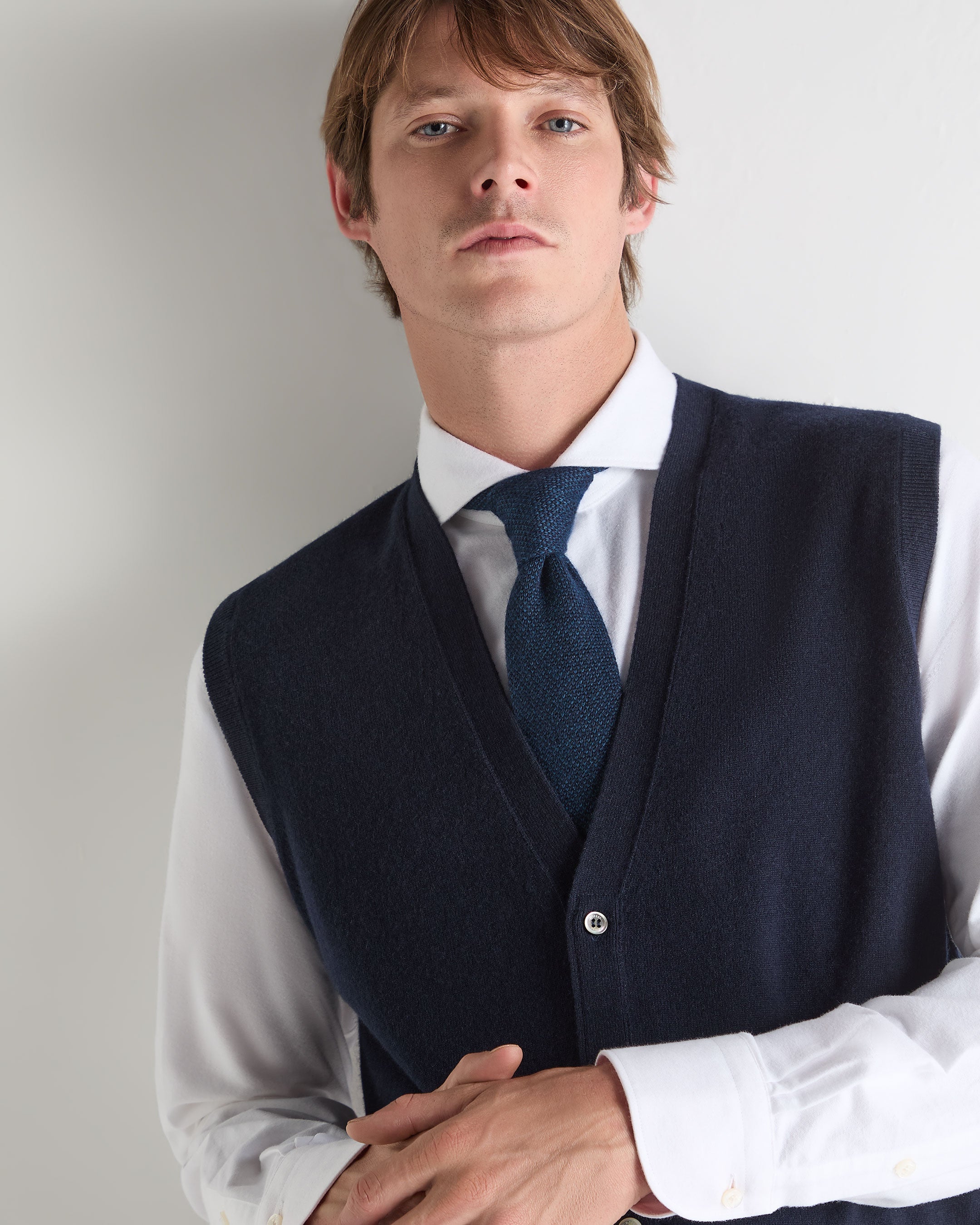 This sleeveless cashmere tank is crafted from 100% organic cashmere in a smooth 1-ply knit, offering a clean, breathable layer with year-round appeal. The full button placket lends a refined finish, while its tailored shape makes it ideal over a crisp shirt or beneath a jacket on cooler days.