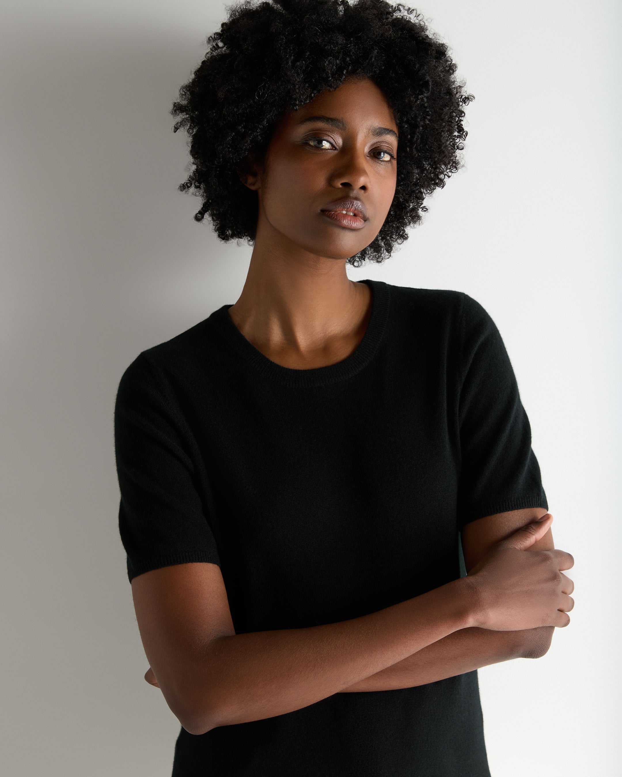 – Short sleeves create an easy silhouette that pairs seamlessly with everything from denim to tailored trousers