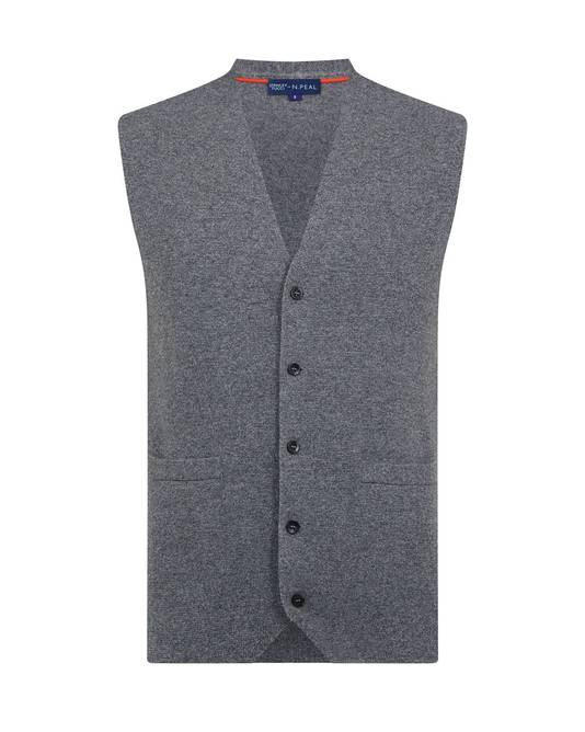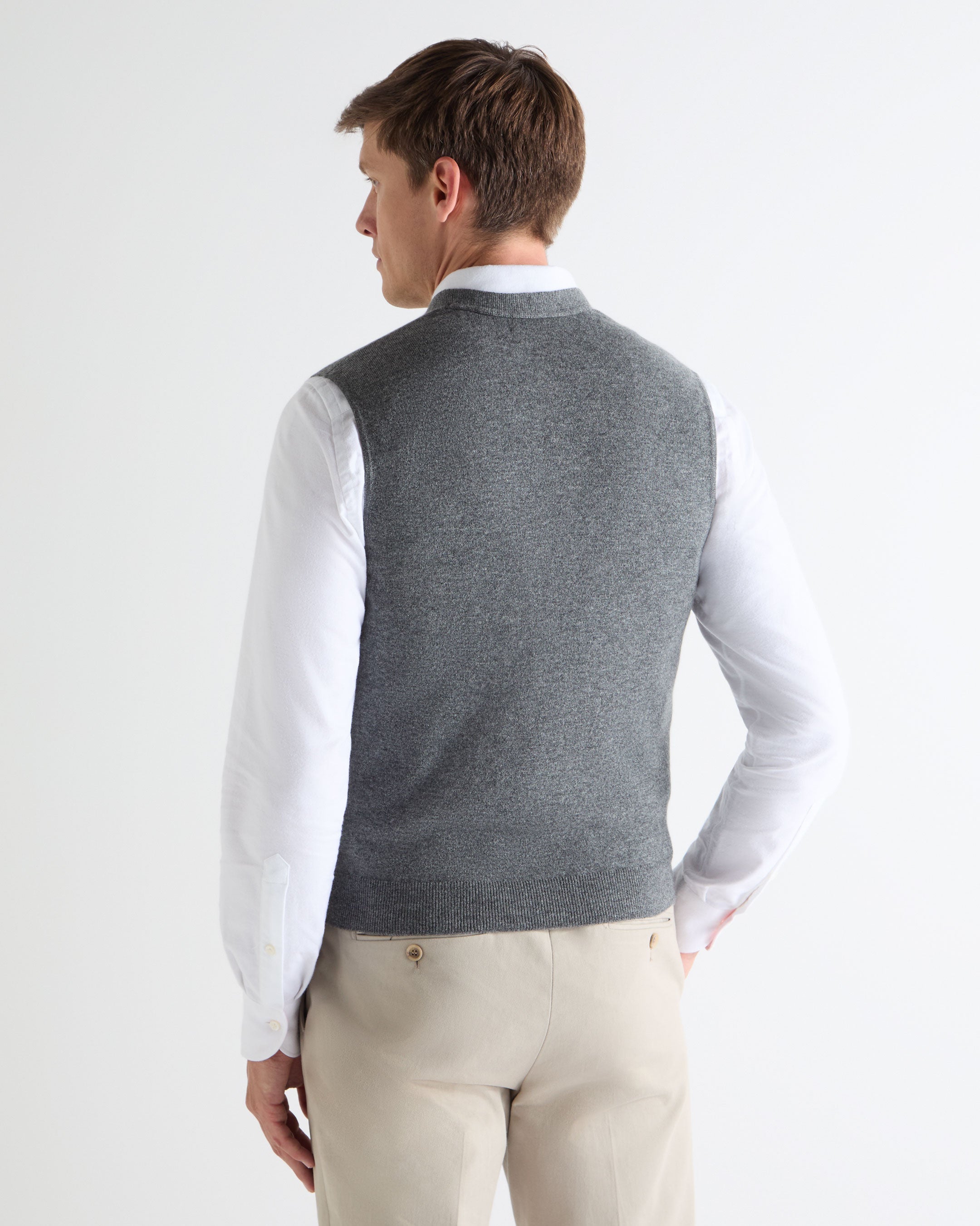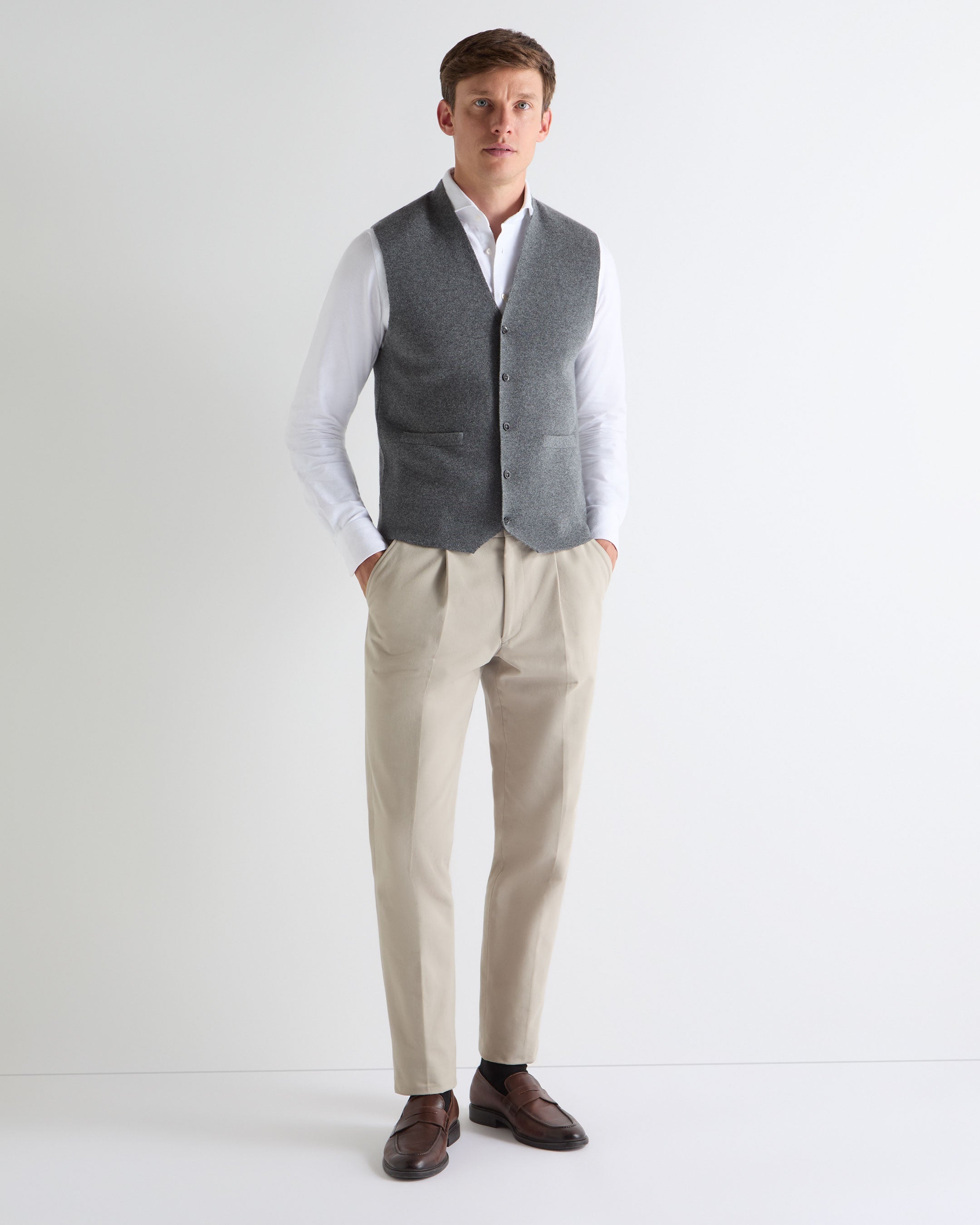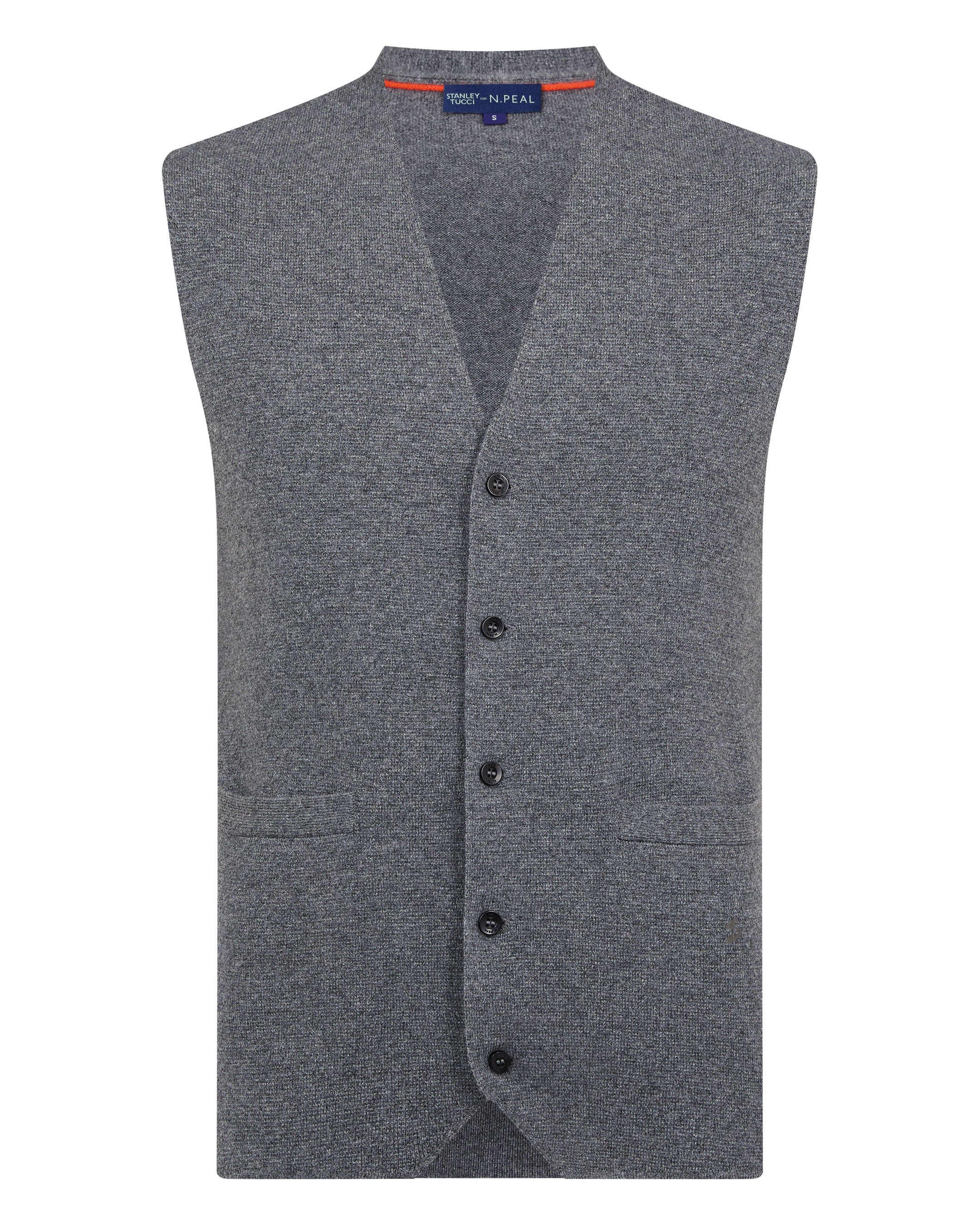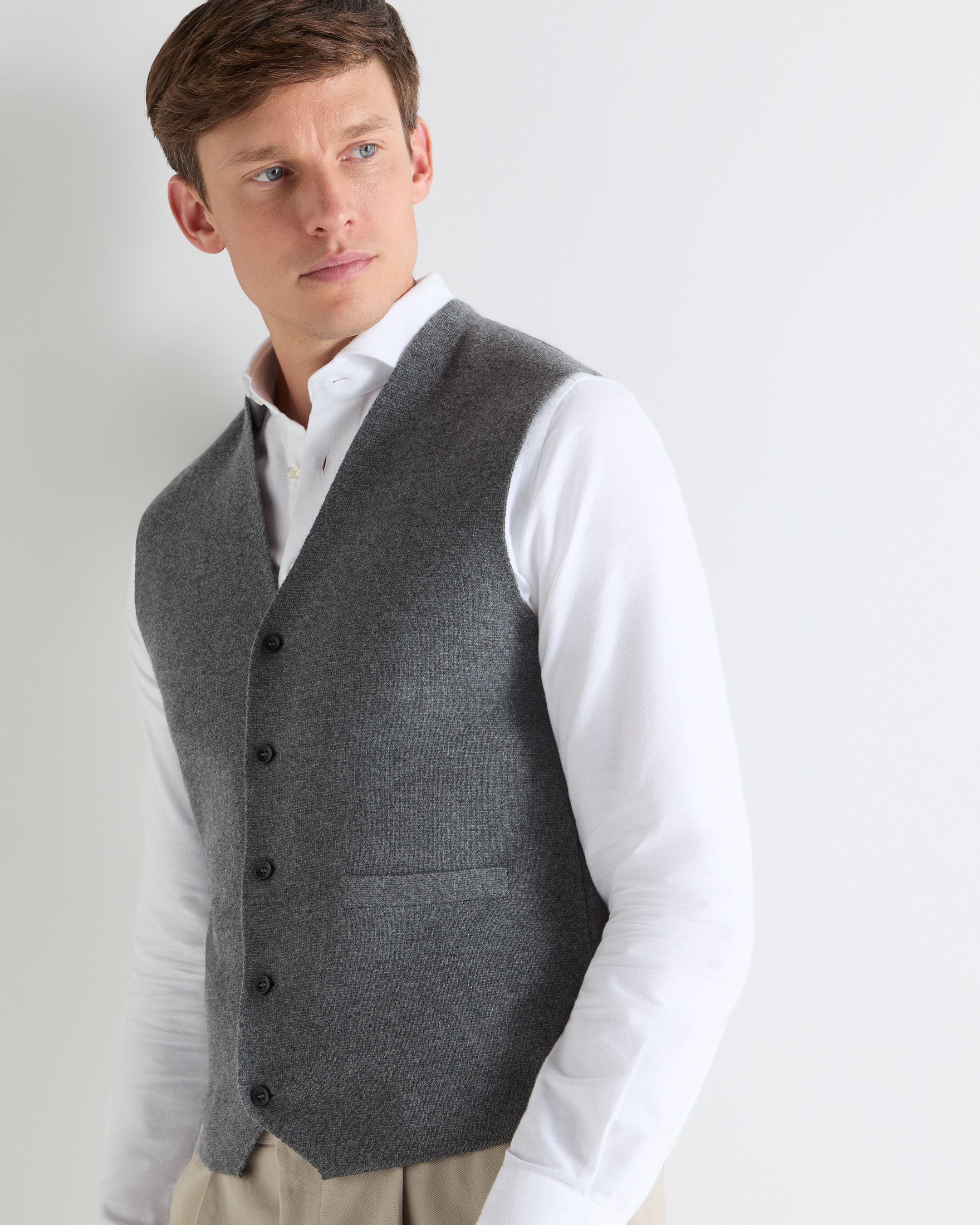 Much like the man himself, the Tucci Waistcoat combines understated elegance with exceptional ease. Inspired by Stanley Tucci’s effortless travel wardrobe, this Milano knit front with a smart cut-away hem is tailored for layering. 100% organic pure cashmere. Also available in navy blue. Hand wash.