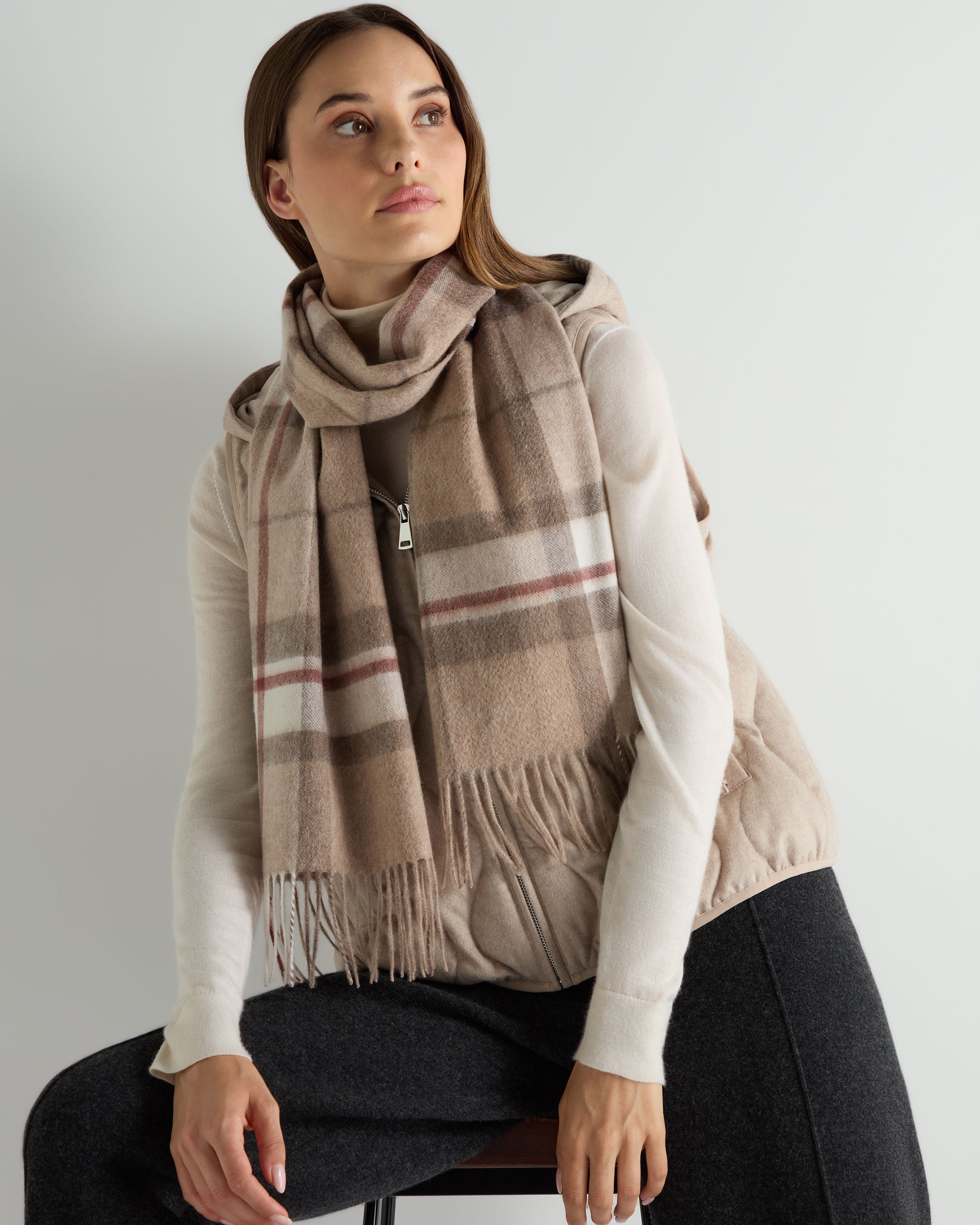 Wrap yourself in refinement with this pure cashmere check scarf — an effortless finishing touch for city strolls or countryside escapes. Its generous proportions and subtle fringe detailing make it as versatile as it is luxurioeu.