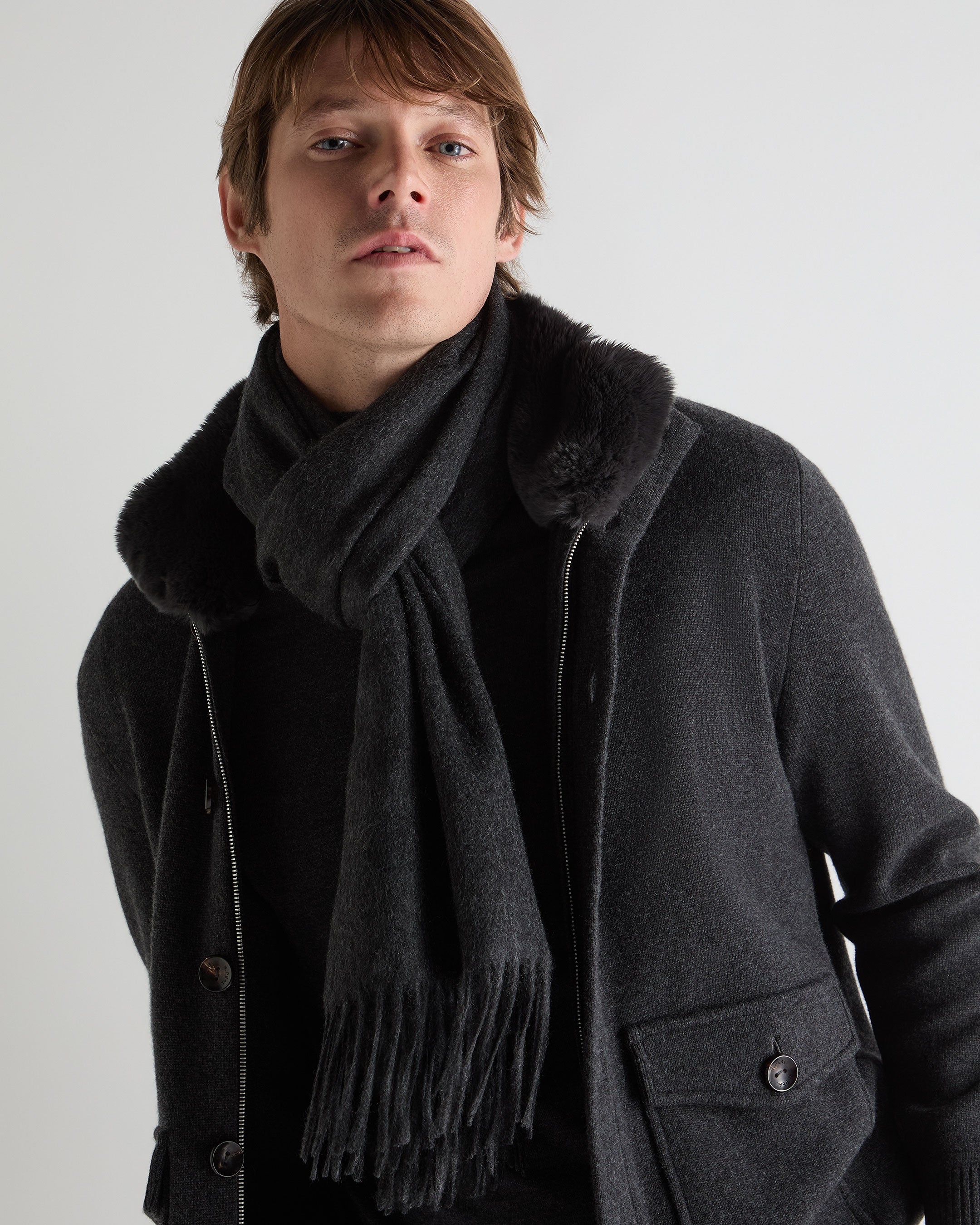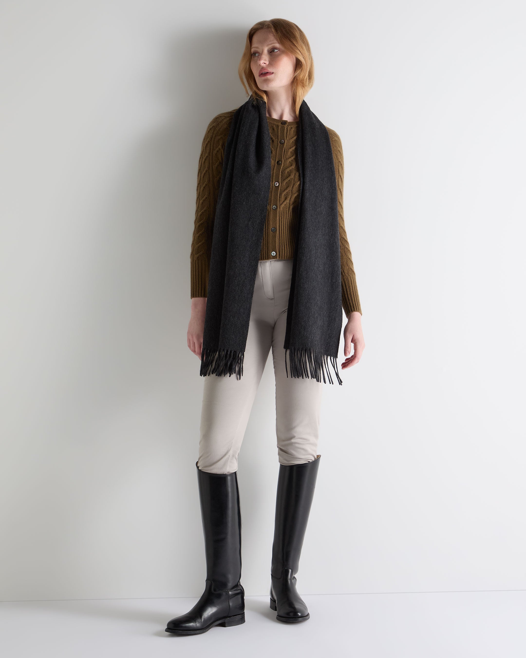 Wrap up in understated refinement. This woven scarf delivers effortless warmth with a featherlight handle and softly brushed finish. Long fringed edges nod to timeless tradition, while the generous proportions make it ideal for layering over outerwear or folding into your carry-on.