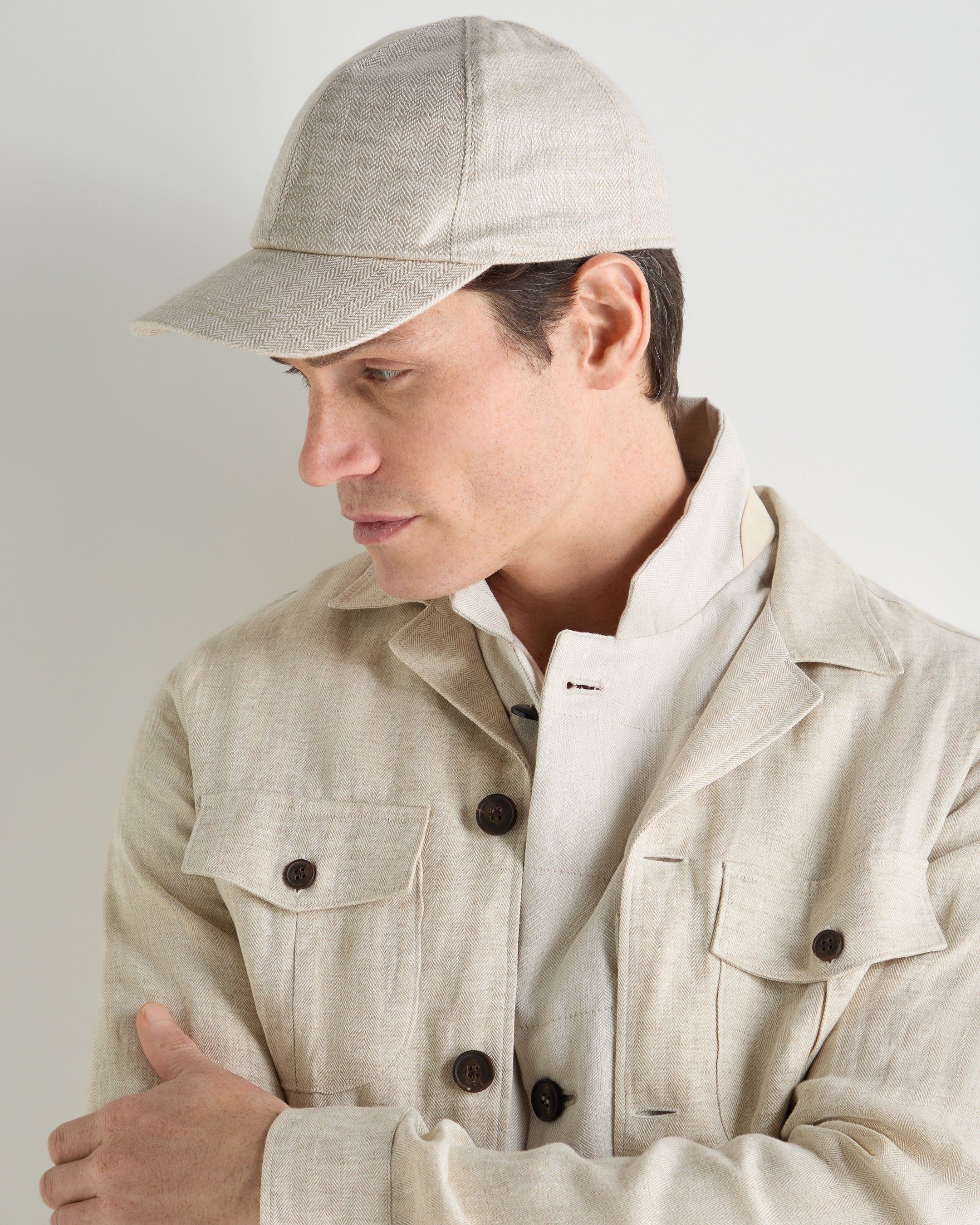 A refined finishing touch for warm-weather dressing, this linen cap brings quiet structure to off-duty looks. Designed to travel easily and wear effortlessly, it pairs classic tailoring cues with relaxed ease — ideal for days spent moving between city streets, countryside walks and time away.