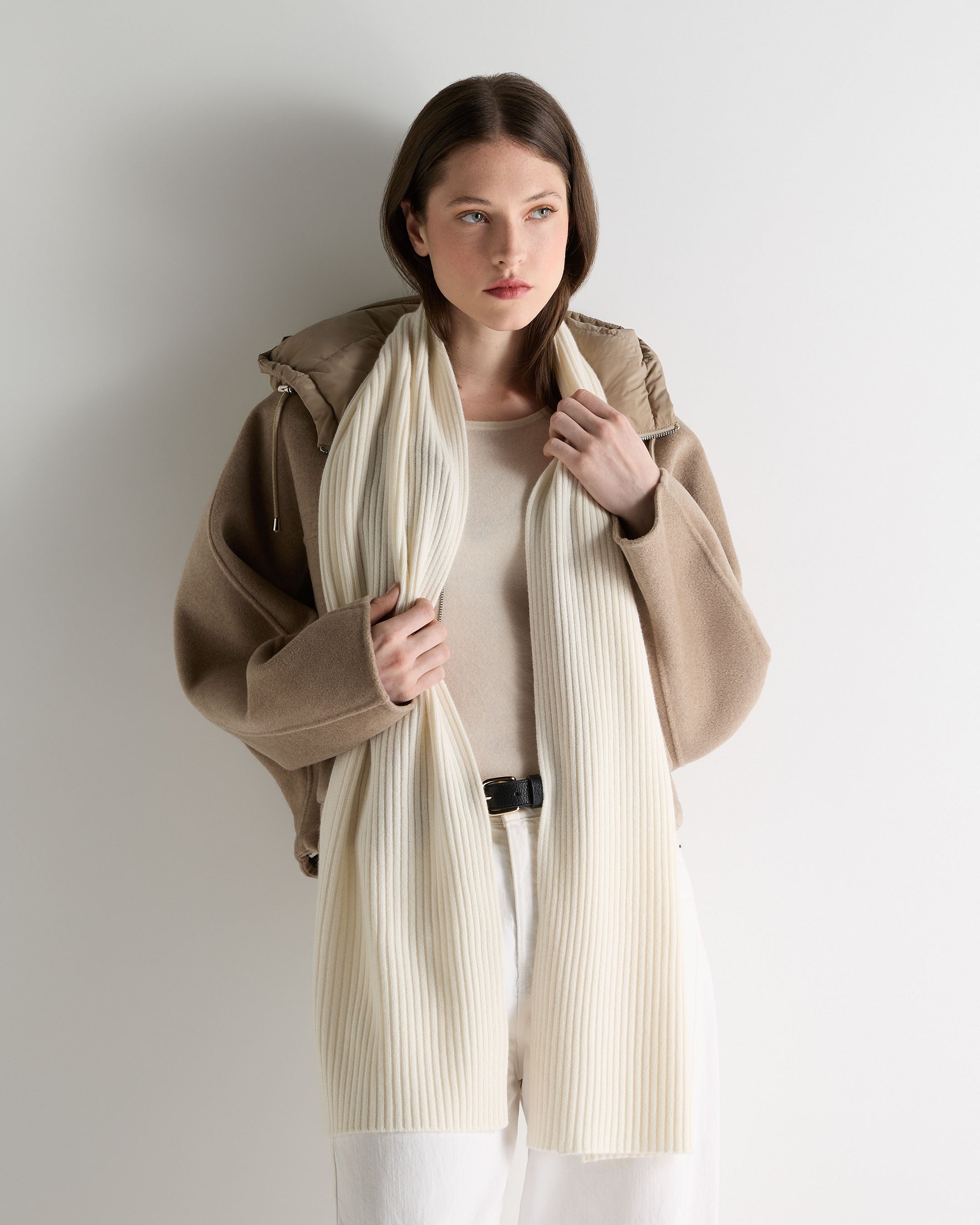 Designed for cool-weather confidence, this ribbed scarf brings elevated ease to everyday layering. Shorter in length for a refined silhouette, it's a versatile piece that works just as well on coastal strolls as it does on city streets. Understated yet luxurious, it’s a seasonal staple made for those who travel light but live well.