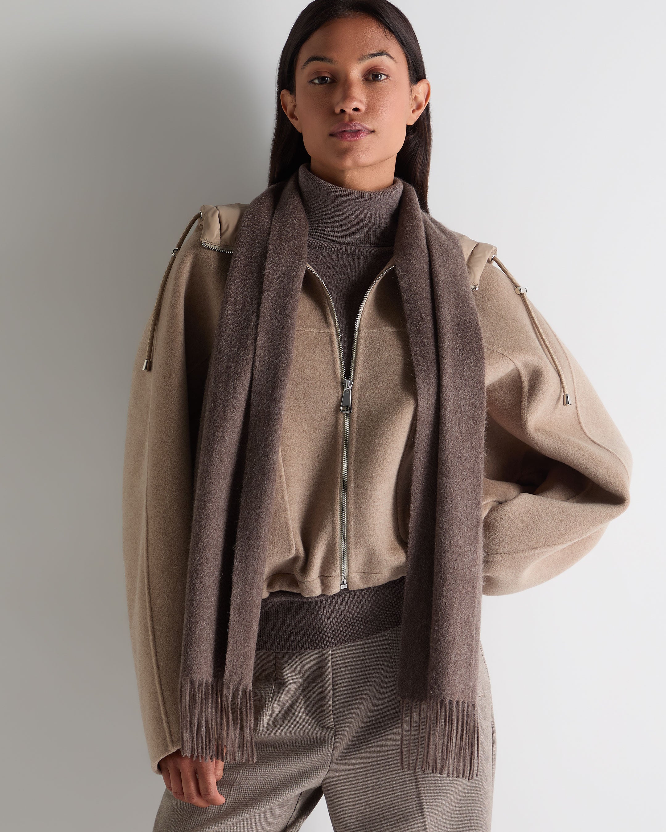 Effortless elegance, scaled for everyday versatility. This shorter woven scarf offers a refined finishing touch with just the right amount of movement, framed by delicate tassels for timeless appeal. Ideal for travel, layering, or elevating your essentials.