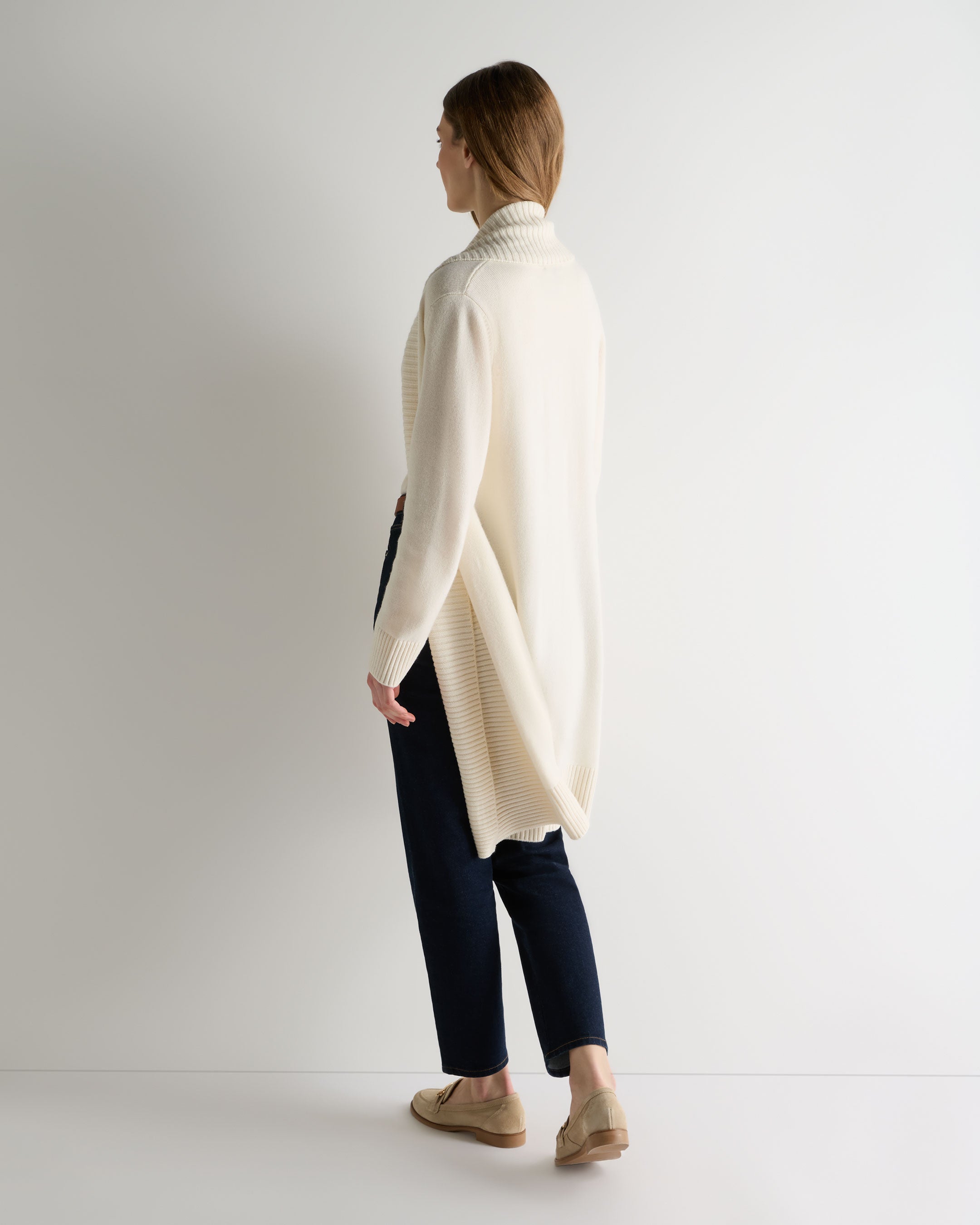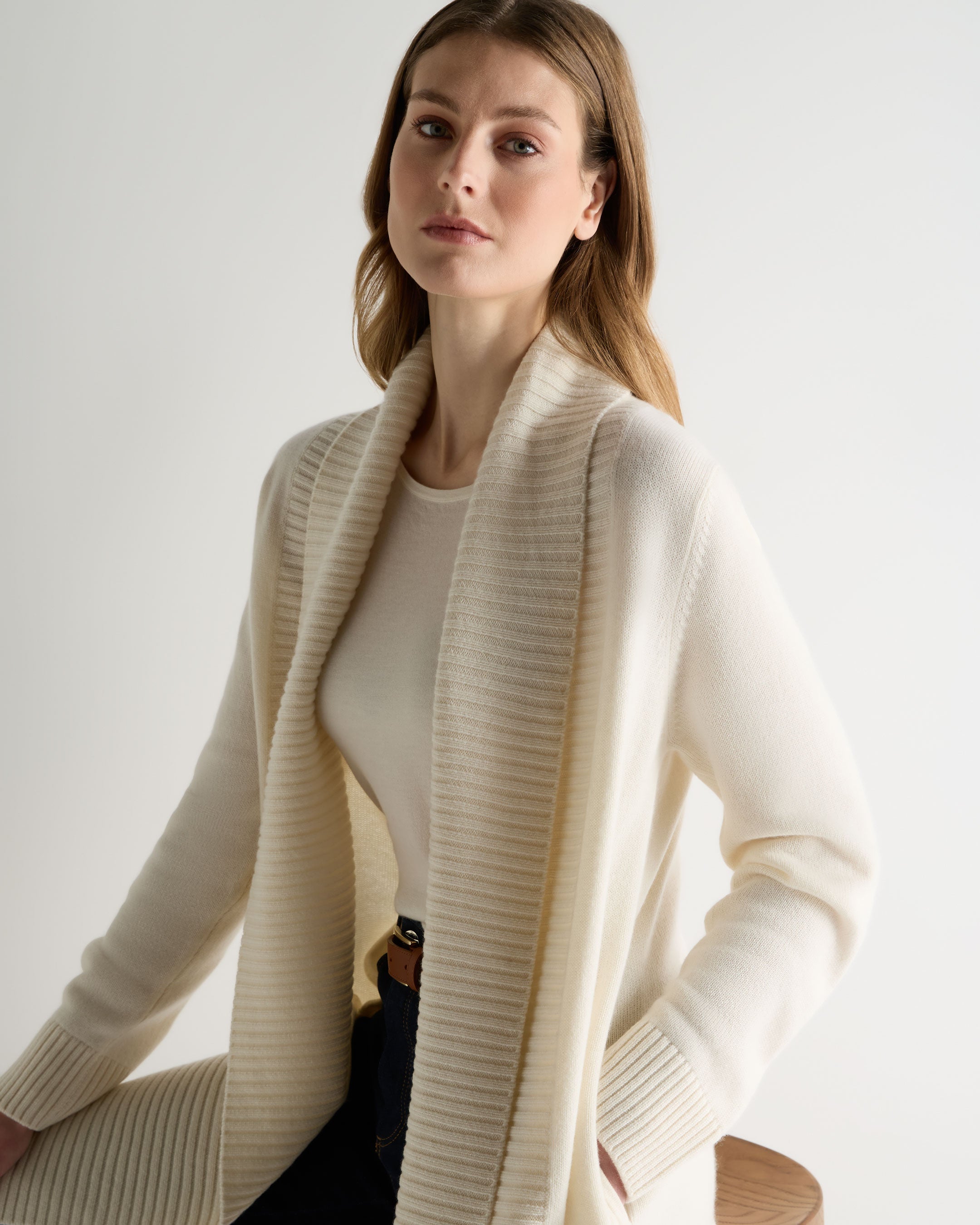 A quietly luxurious layer designed for effortless sophistication, this longline cardigan brings warmth, softness and clean modernity to every day. Its fluid silhouette and finely crafted texture make it the perfect piece for relaxed weekends, polished travel or refined layering in the city.