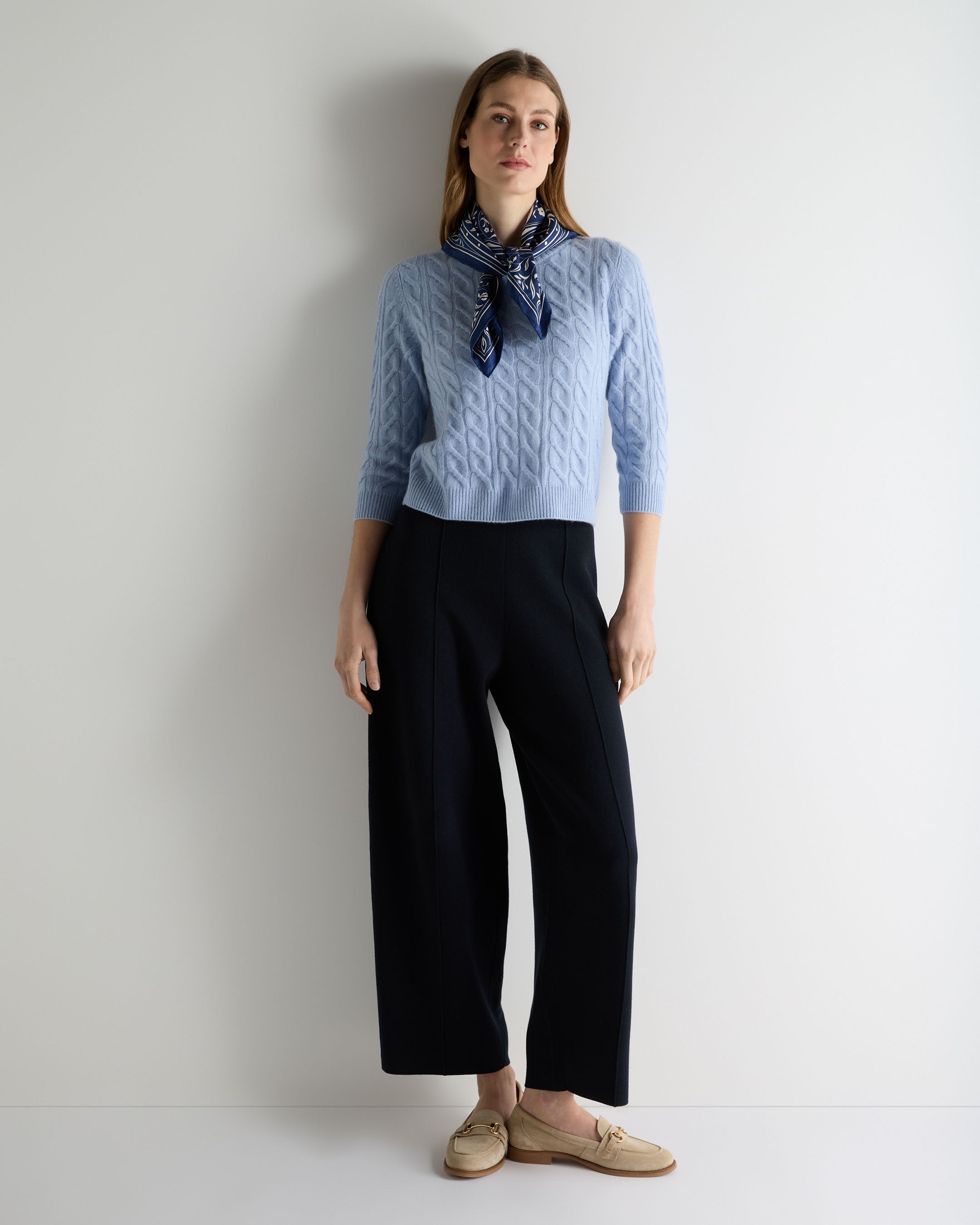 A timeless staple with an elevated, contemporary feel, this cable-knit round neck brings effortless sophistication to colder days. Its sculpted texture and beautifully soft handle make it the ideal piece for crisp mornings, relaxed weekends or refined après-lunch dressing.