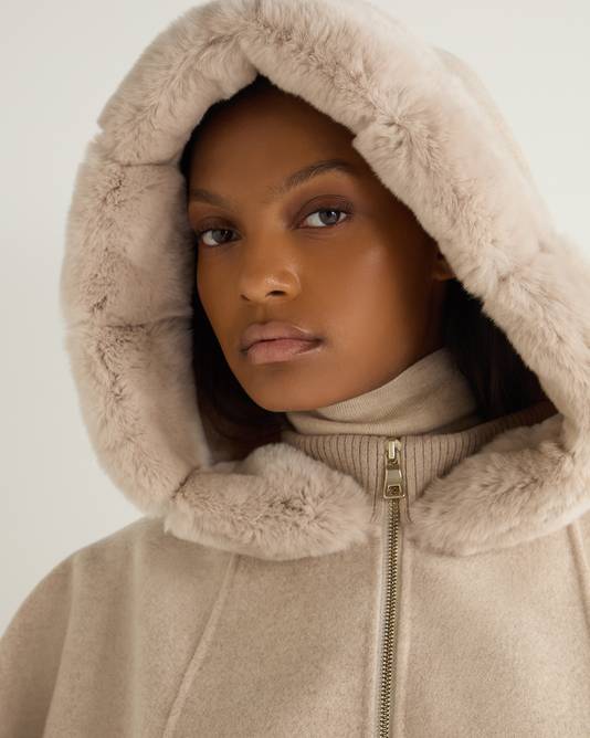 - A beautiful ecru fur trimmed hood and cuffs, adding a touch of opulence