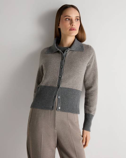 Women's Dogtooth Cashmere Cardigan With Fur In Elephant Grey