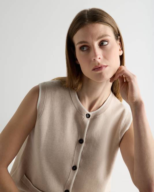 A refined take on warm-weather layering, this double-faced tank top brings quiet polish to everyday dressing. Cleanly cut and thoughtfully finished, it is the kind of piece that travels easily — worn alone on sunlit afternoons or layered through cooler moments without ever feeling overworked.