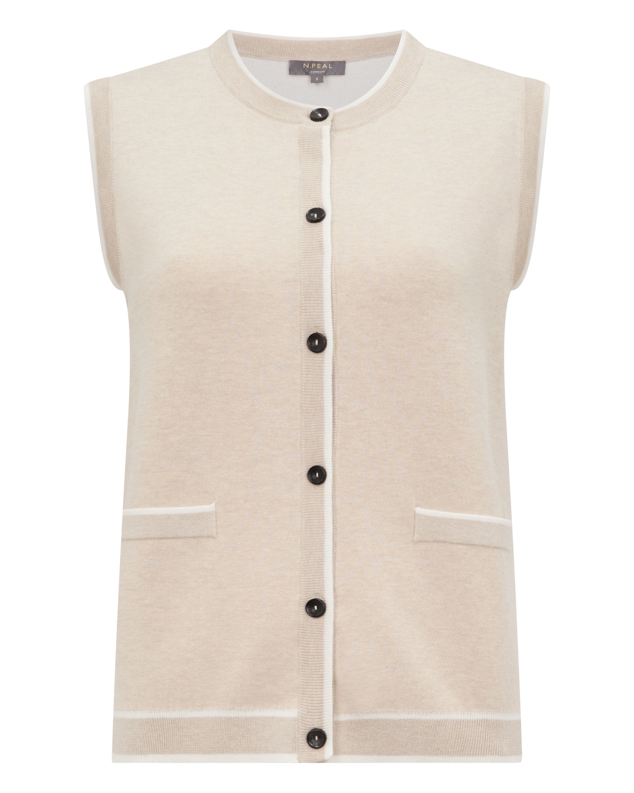 – Sleeveless silhouette with a neat crew neckline for a modern, understated profile