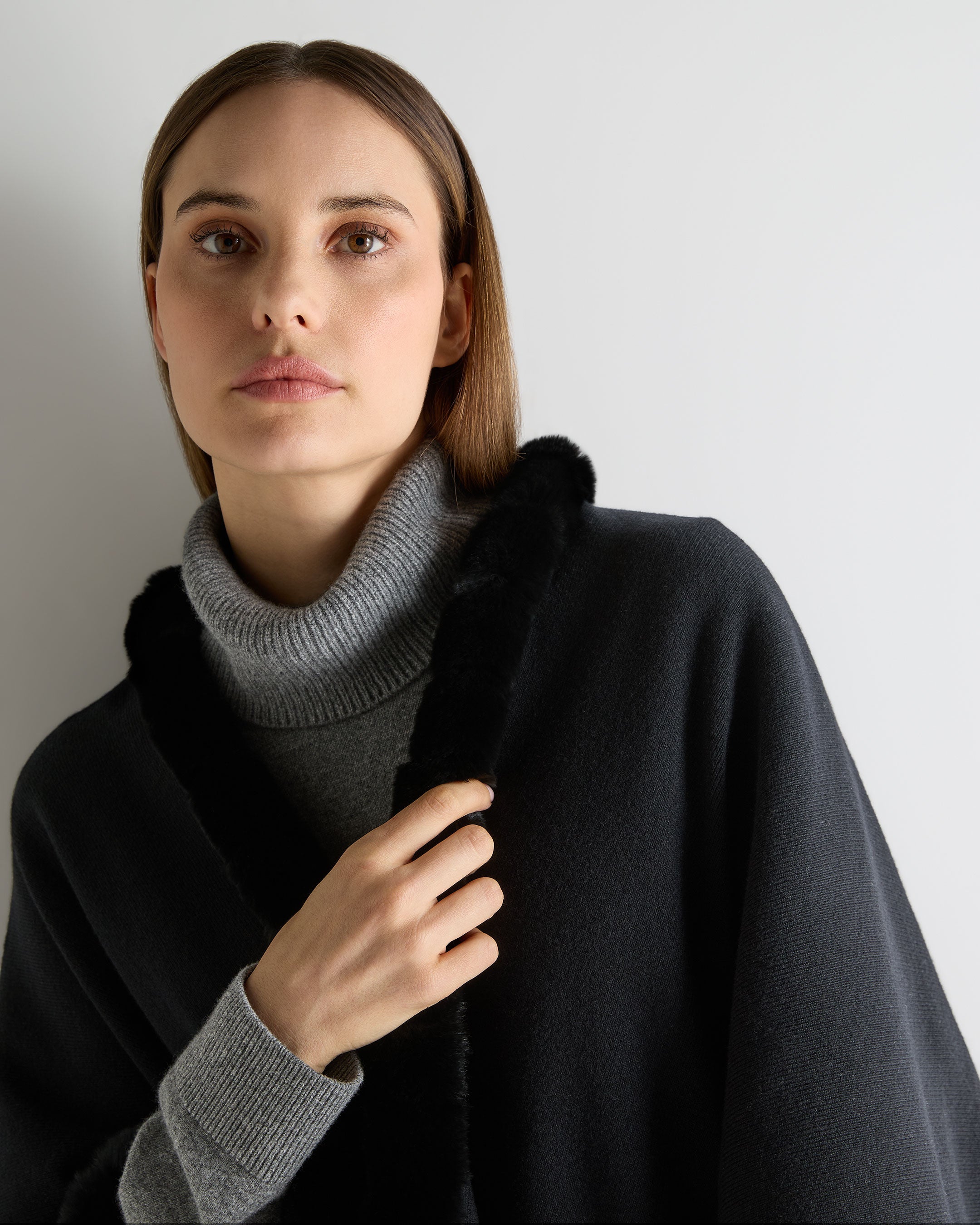A statement in effortless elegance, this cashmere cape brings together refined softness and beautifully considered detailing. The sweeping silhouette drapes with quiet confidence, while the plush rex fur trim adds a touch of indulgence that feels at home in both relaxed escapes and elevated city moments. Light yet cocooning in its 1-ply construction, it’s the ideal layer to slip over knitwear, tailoring or travel separates — transforming even the simplest look with its understated luxury.
