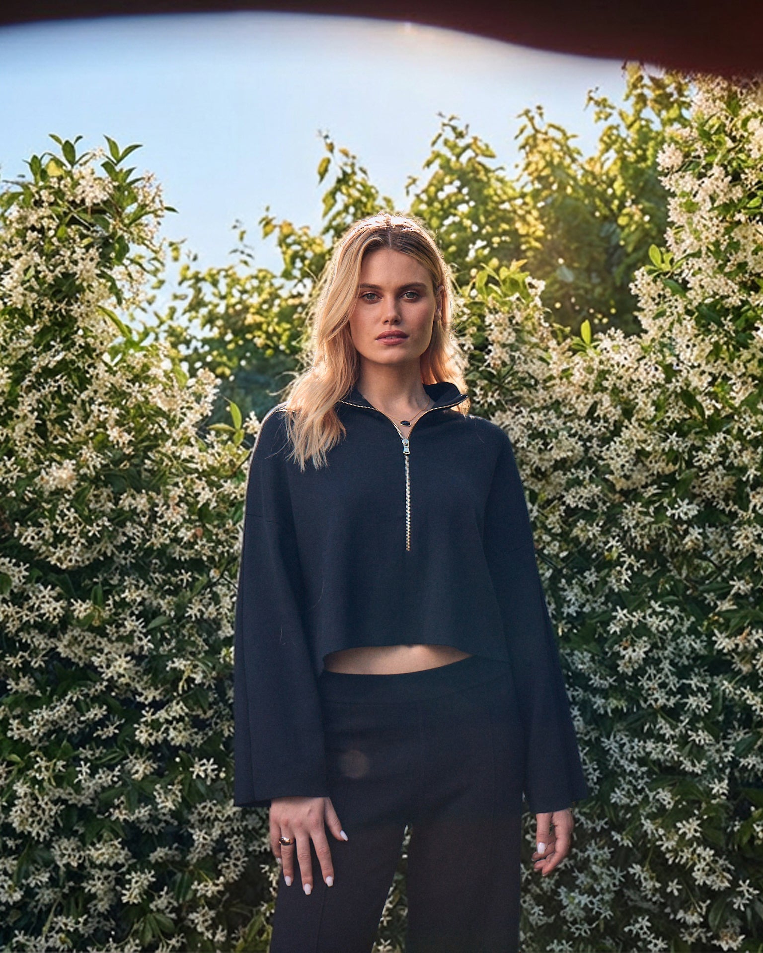 – Stand collar with a smooth half-zip adds versatility — wear it open for ease or zipped for a sharper line