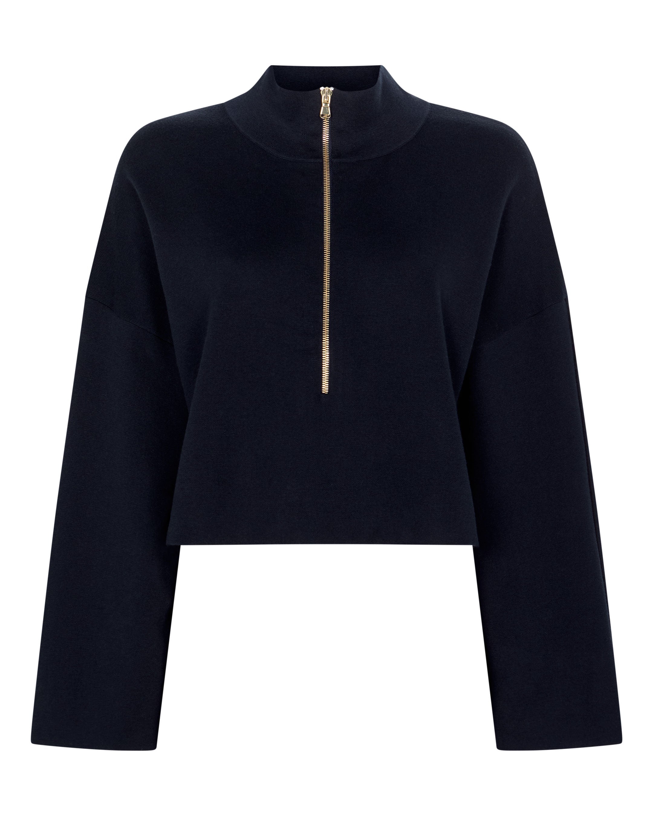 A modern staple with a refined, architectural edge. This half-zip sweatshirt is cut to a clean, cropped silhouette that offers instant polish while still feeling effortlessly relaxed. The stand collar and sleek metal zip lend a subtly sporty attitude, balanced by the smooth, elevated handle of the cotton–silk–cashmere blend.