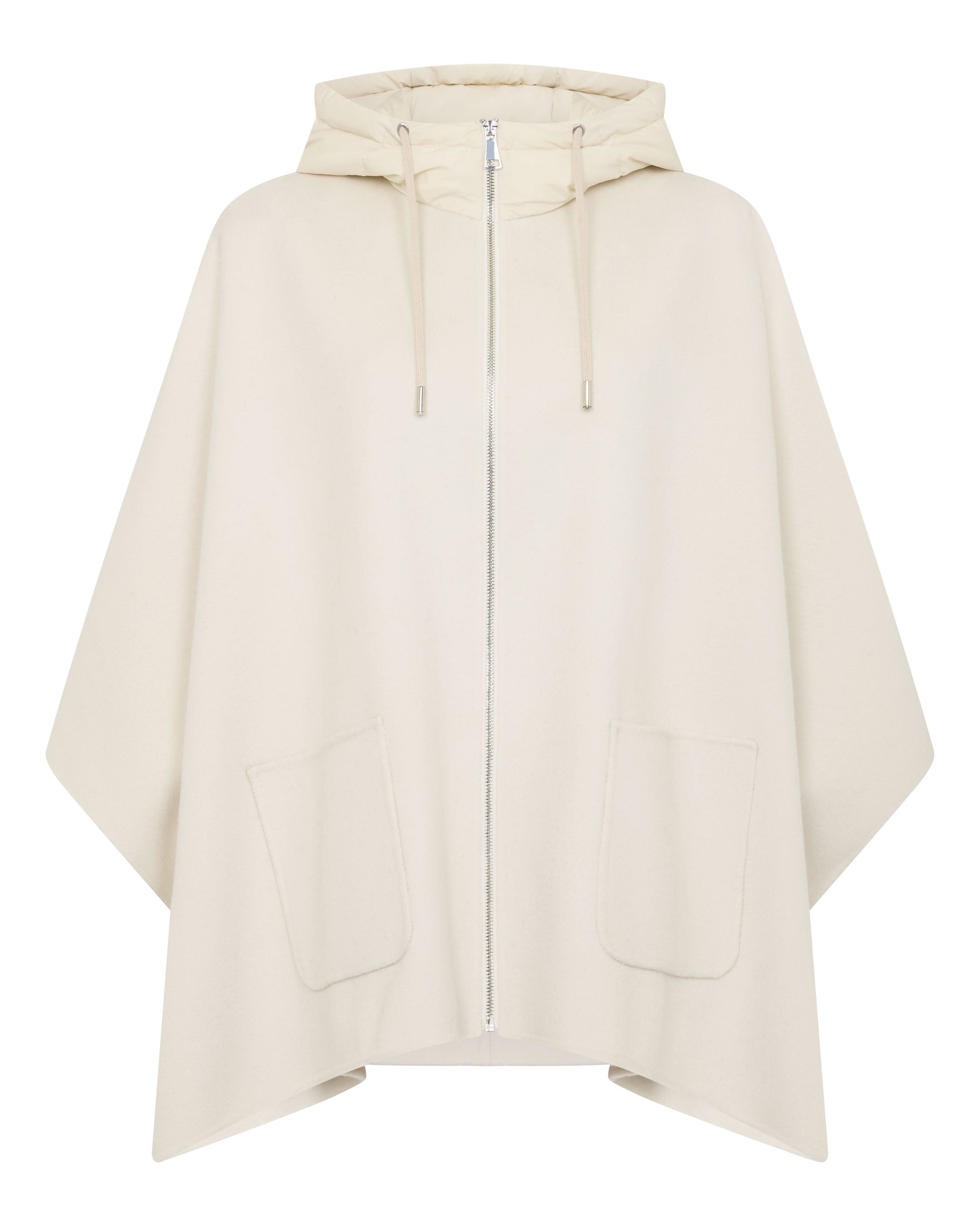 An elegant layering piece for in-between days, this hooded cape blends softness, structure and ease. Cut with fluid lines and finished in a refined cream tone, it slips on effortlessly over fine knits or timeless essentials — offering just the right amount of warmth with unmistakable polish.