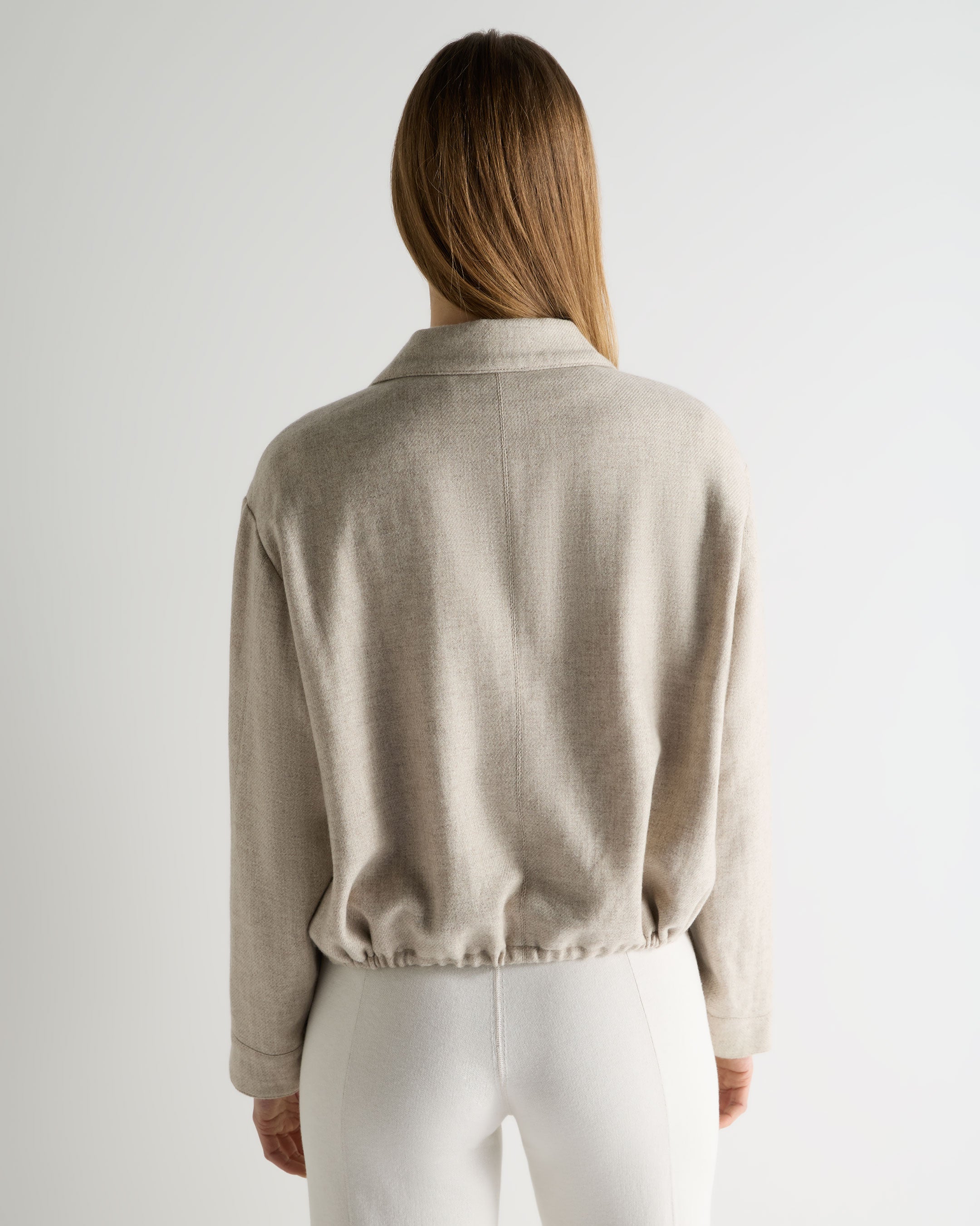 Refined yet relaxed, this woven cashmere jacket brings a quietly luxurious edge to everyday dressing. The softly structured silhouette, adjustable drawcord hem and clean button-through front create a modern layer designed to slip effortlessly between polished days and easy weekends.