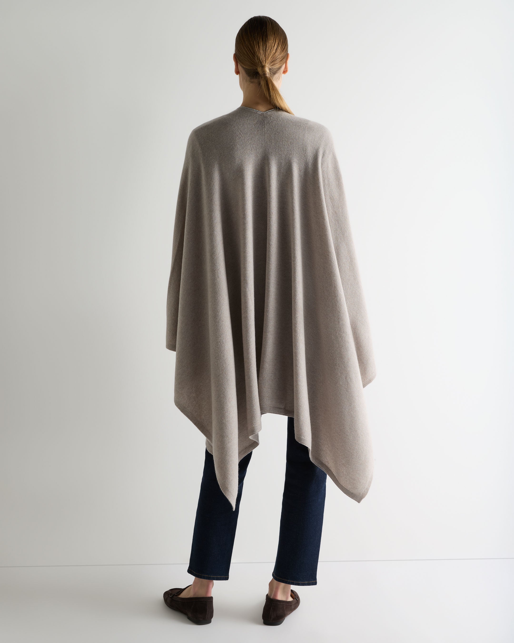 An elegant layer designed for movement, this cashmere cape is defined by its fluid drape and refined ease. Crafted to slip effortlessly over daytime looks...