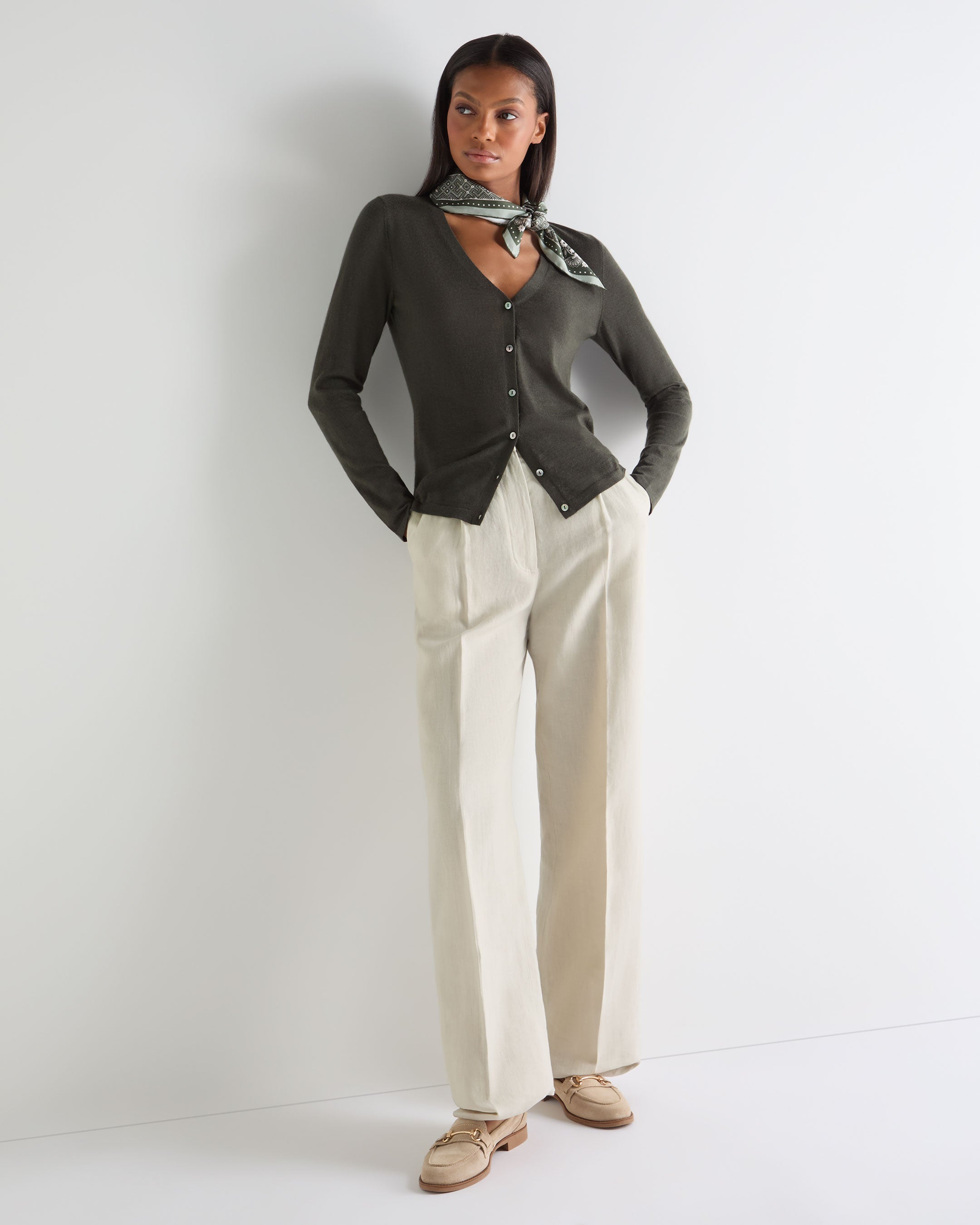 A refined layer with year-round versatility, this superfine cashmere V-neck cardigan brings understated luxury to everyday dressing. Its clean lines and lightweight 1-ply construction create an elegant silhouette that pairs effortlessly with denim, tailoring or travel separates. Worn buttoned for a polished look or open over a simple tee, it delivers the kind of quiet sophistication that elevates even the most relaxed moments.
