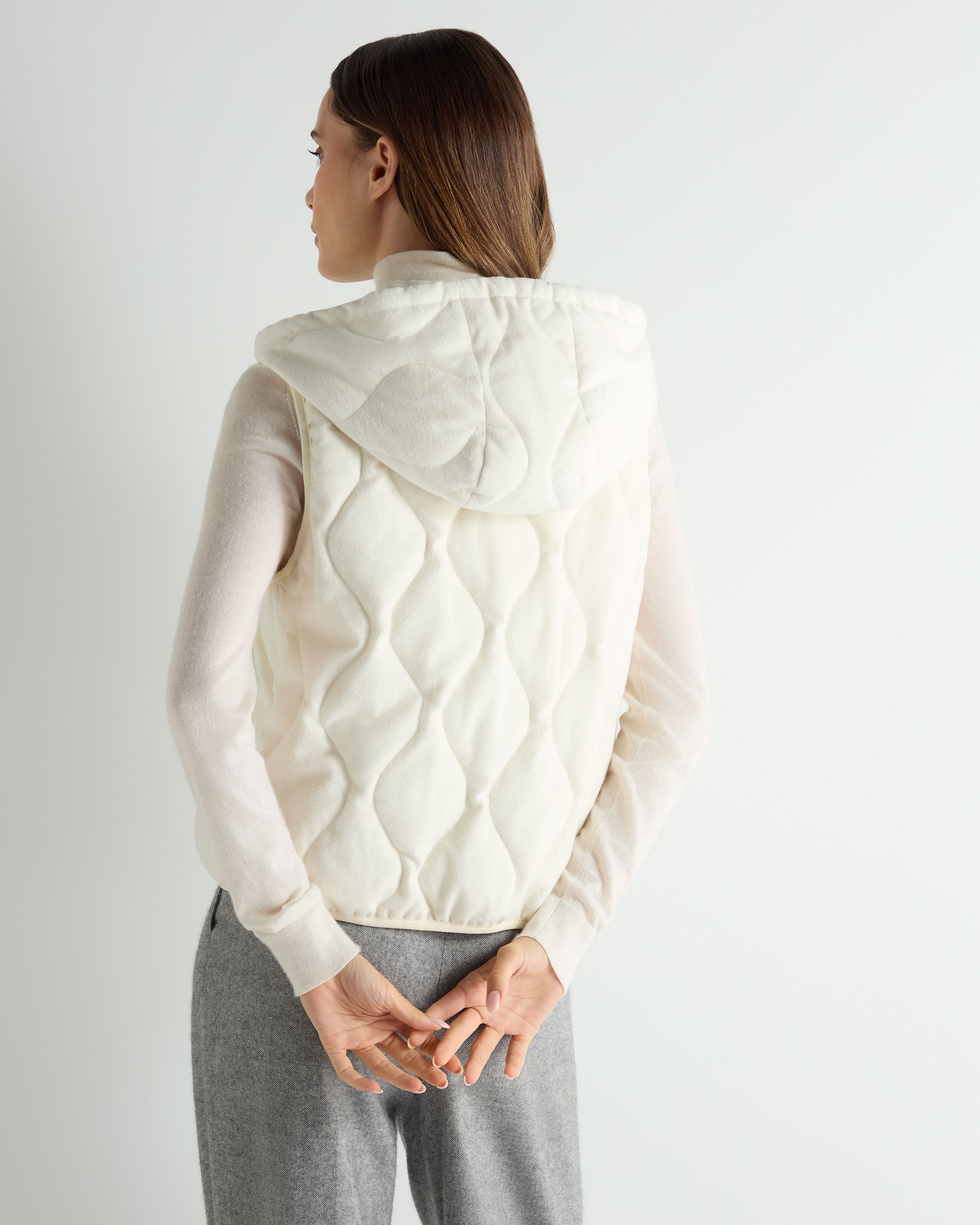 An elegant answer to transitional dressing, this hooded padded gilet blends function with finesse. Lightly structured yet softly voluminous, it’s designed for effortless layering — whether over fine knits or under tailored outerwear. The neutral tone and subtle sheen elevate it beyond the everyday.