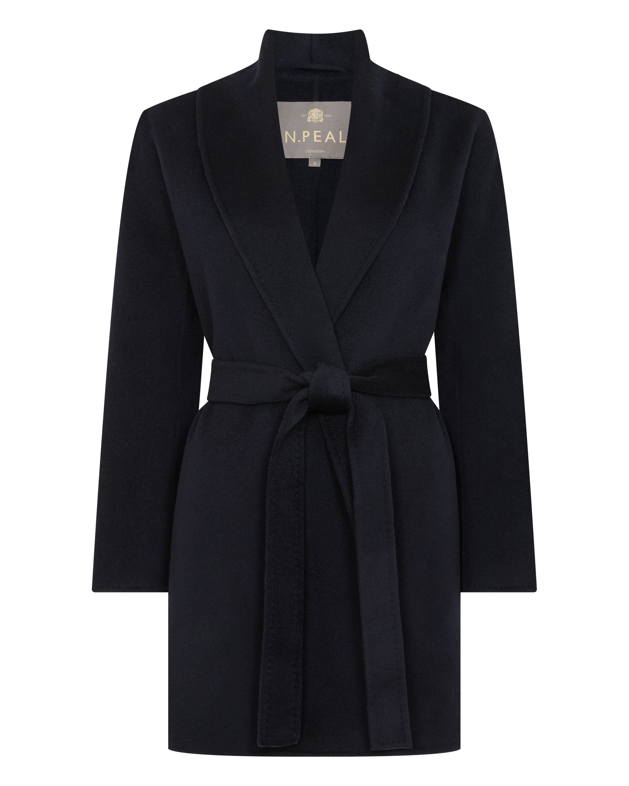 Tailored for ease and elegance, this wrap-style short coat brings a refined nonchalance to cold-weather layering. The belted waist flatters the silhouette while offering versatile styling, whether worn open or cinched. A softly structured shawl collar enhances the minimal profile, inviting endless pairings from casual to considered.